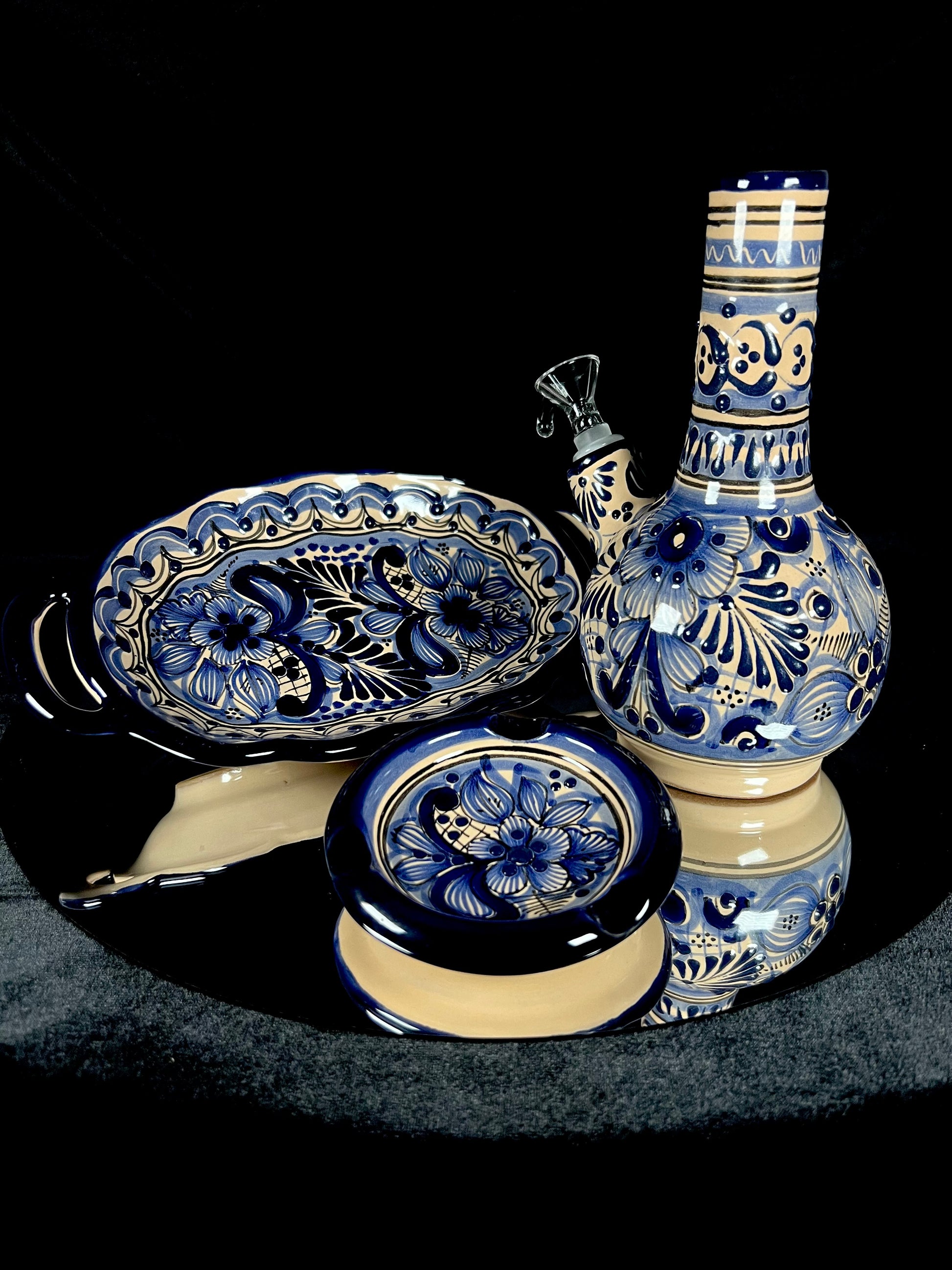 Talavera Collector Sets: Kickstart your themed Talavera collection with these sets, which include various-sized water pipes, rolling trays, and ashtrays. Each piece features matching base colors and accents with unique plumeado and floral designs, creating a harmonious and visually stunning ensemble.