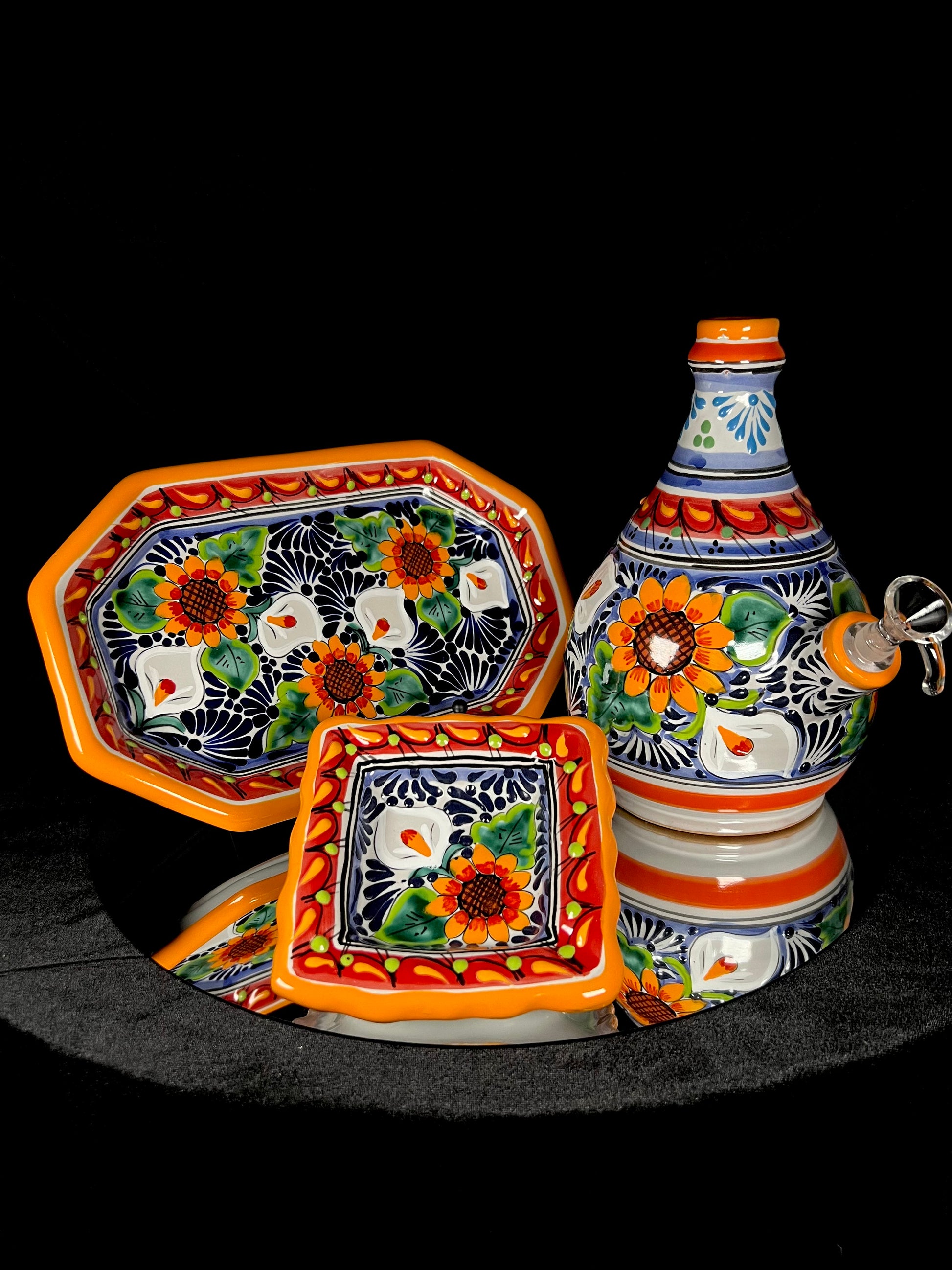 Talavera Collector Sets: Kickstart your themed Talavera collection with these sets, which include various-sized water pipes, rolling trays, and ashtrays. Each piece features matching base colors and accents with unique plumeado and floral designs, creating a harmonious and visually stunning ensemble.