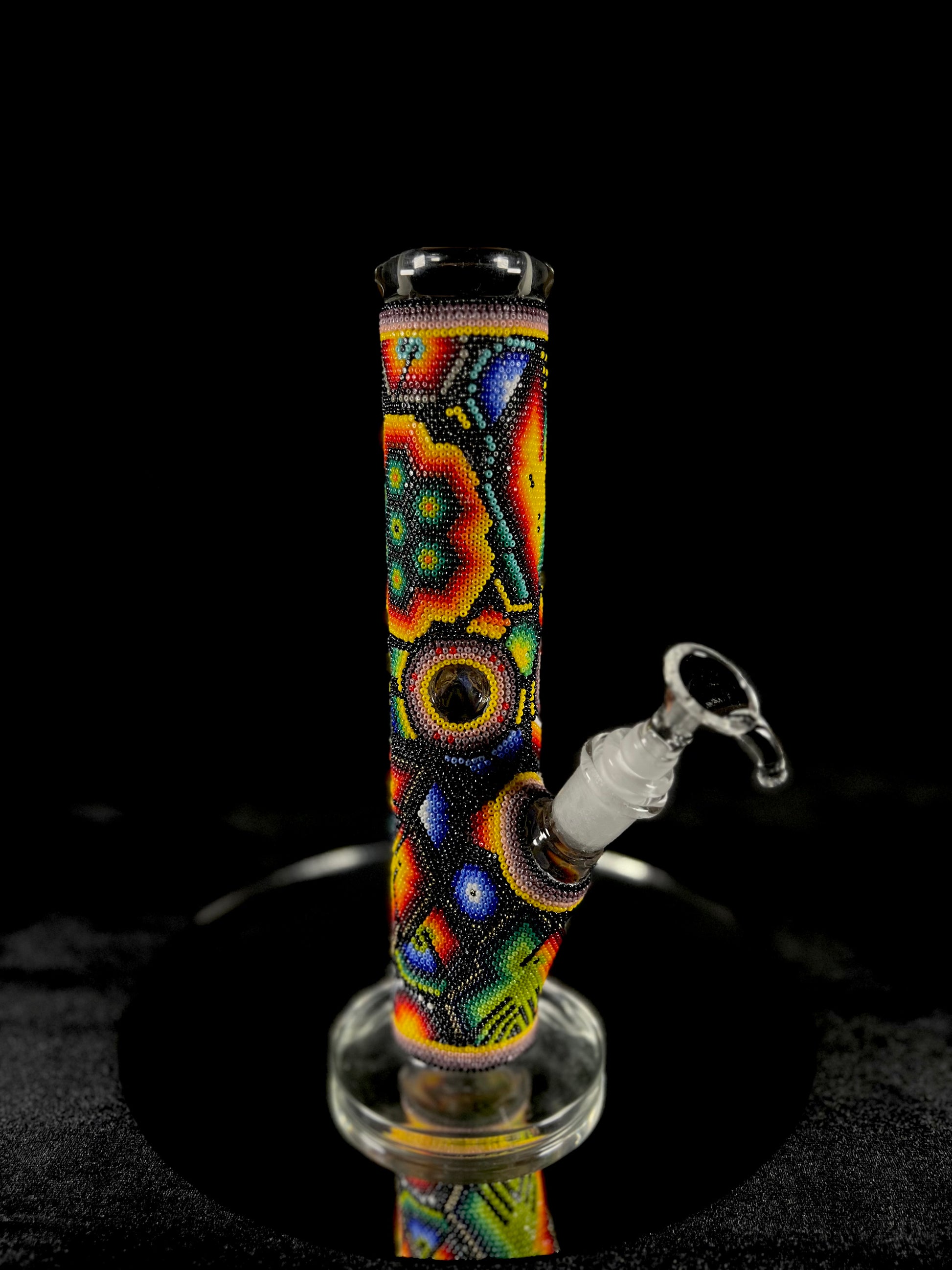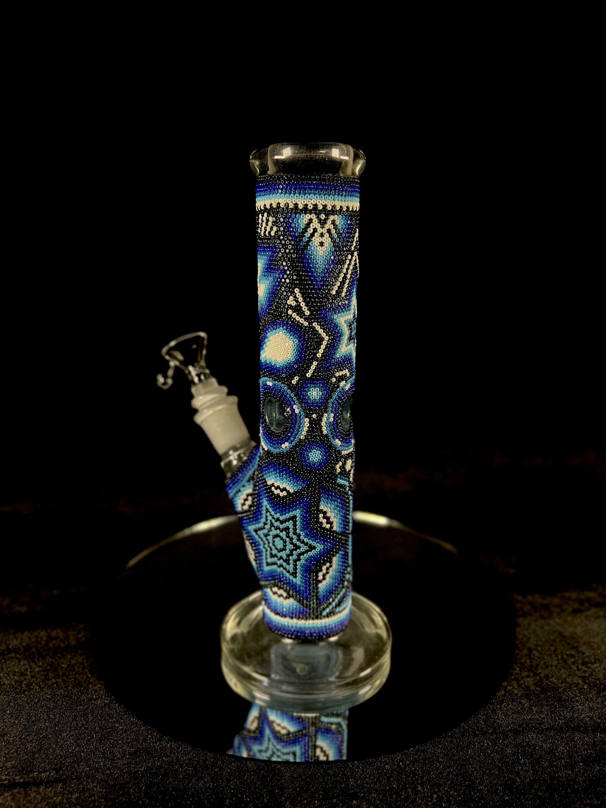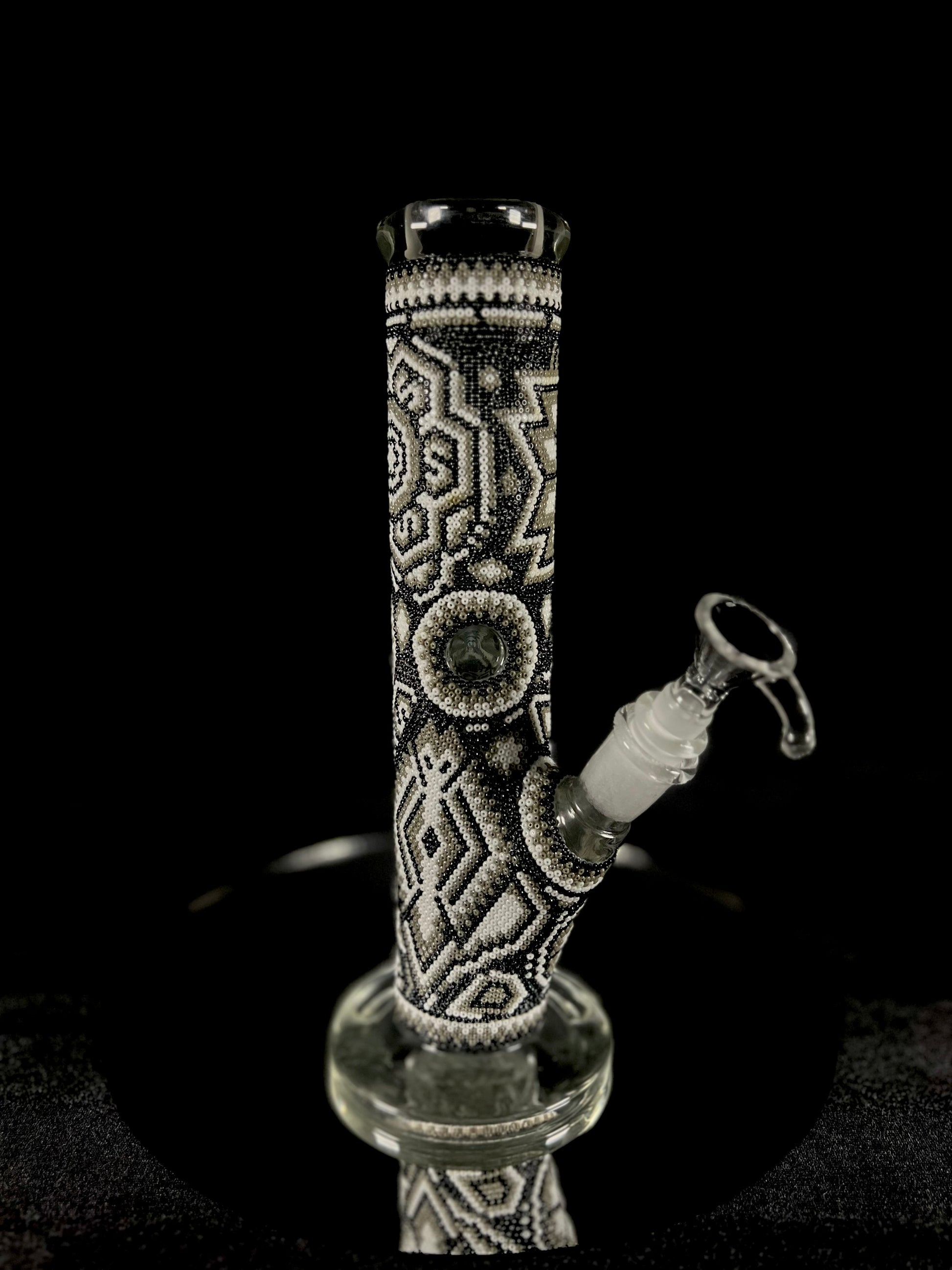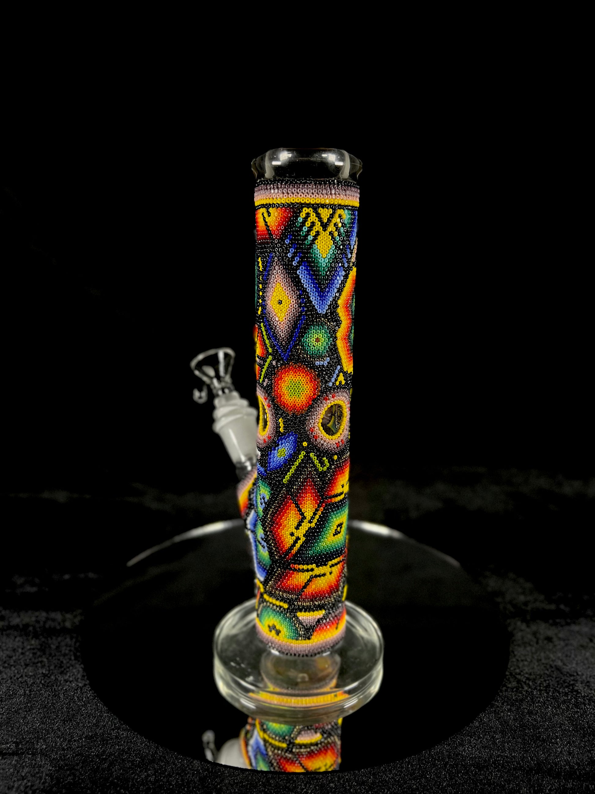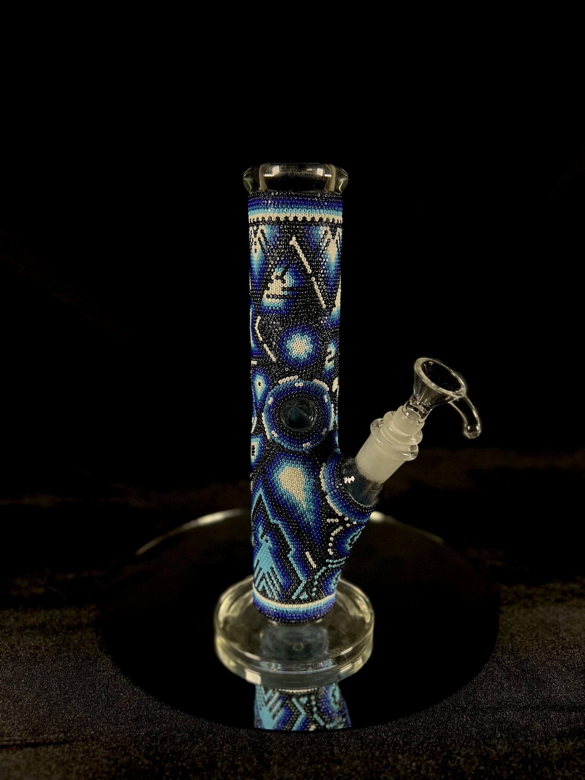 Huichol Water Pipes: These exquisite water pipes feature unique hand-beaded Huichol art with freestyled patterns and symbols. Crafted over multiple days, each piece boasts a strong epoxy base and vibrant color schemes, making it a true one-of-a-kind creation.