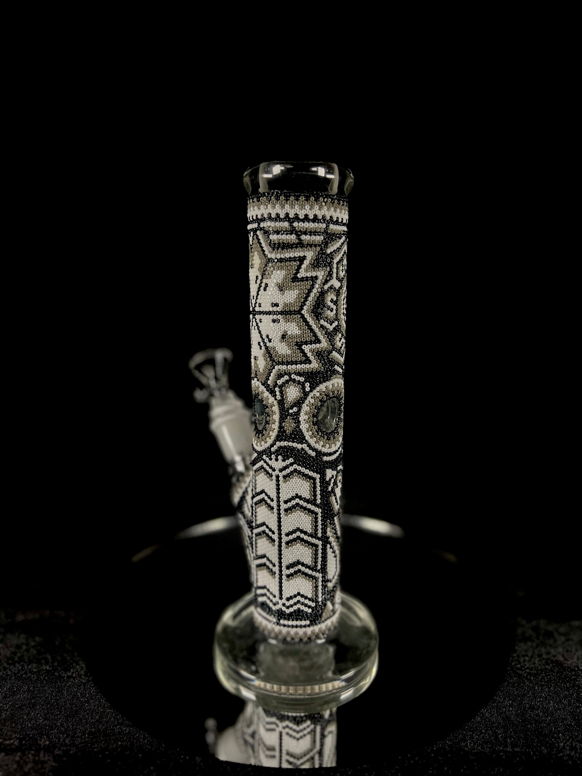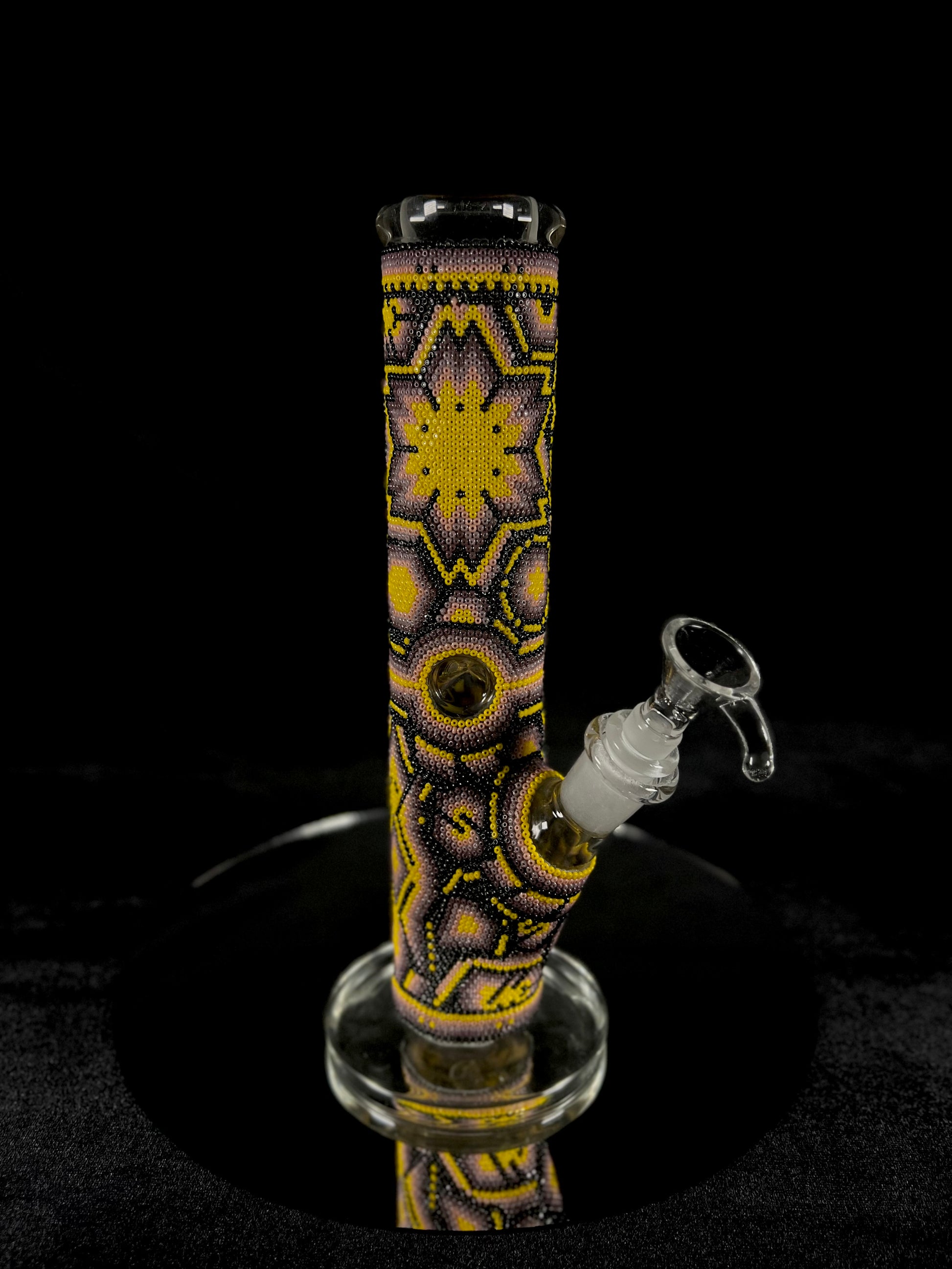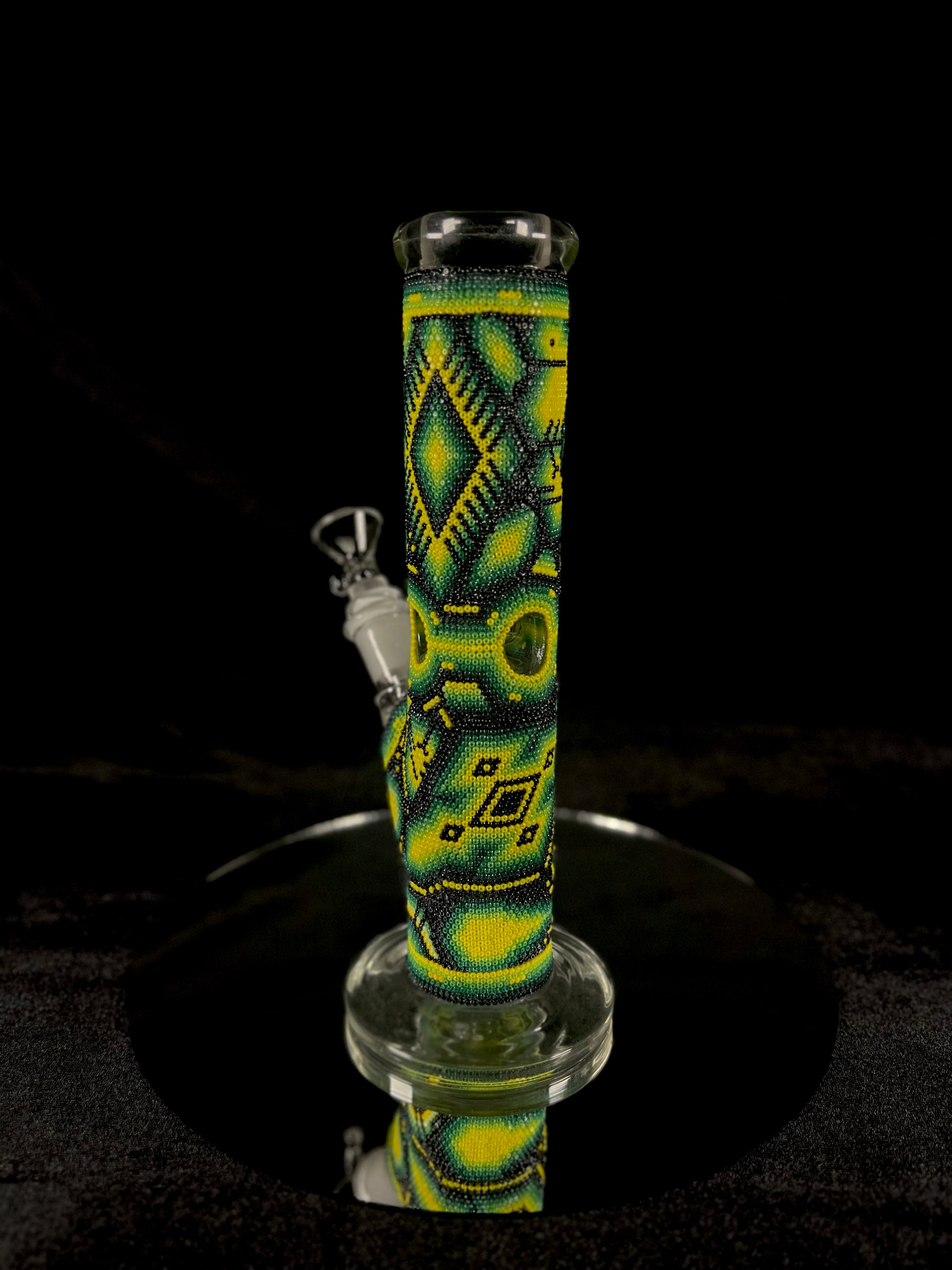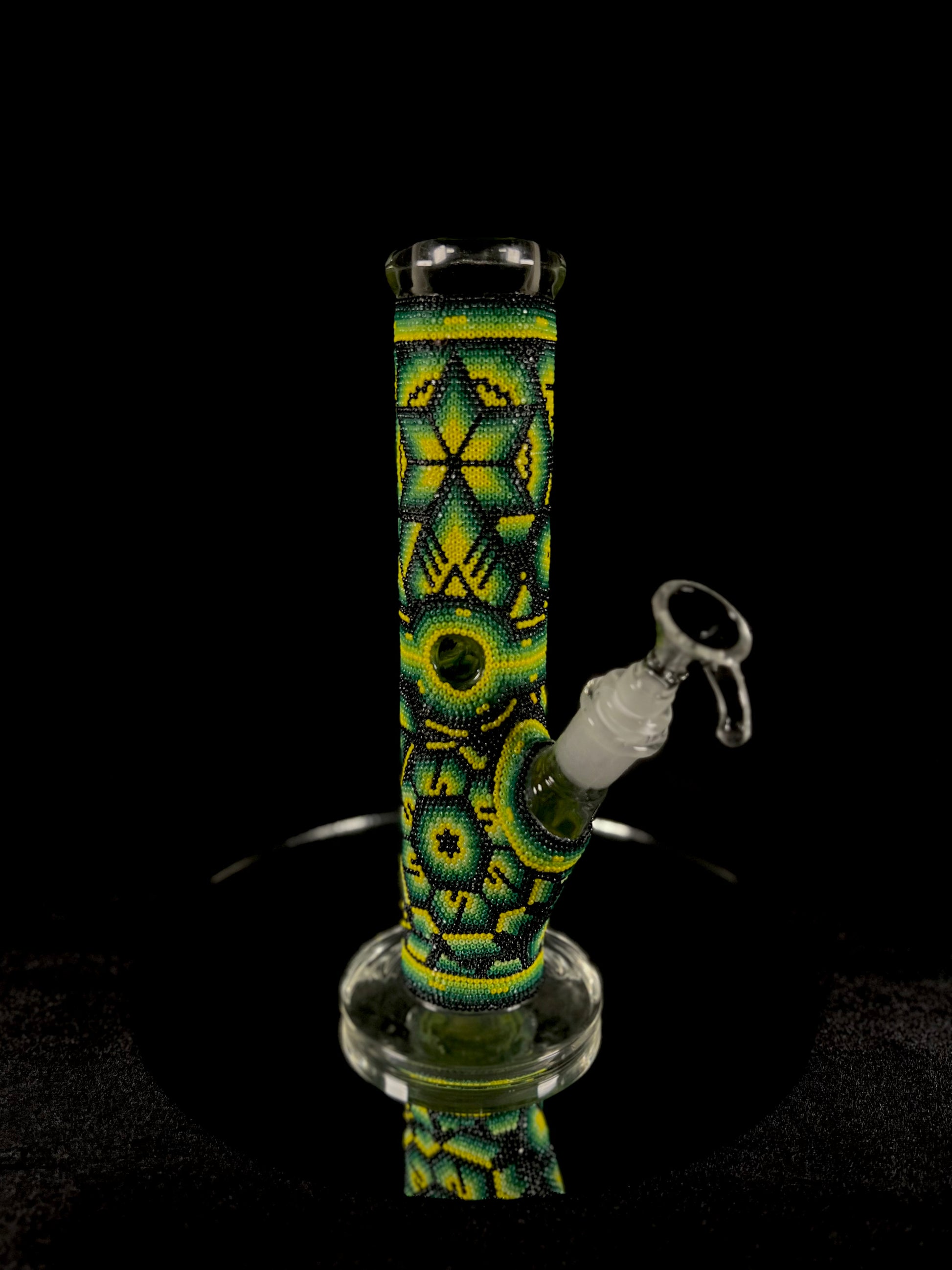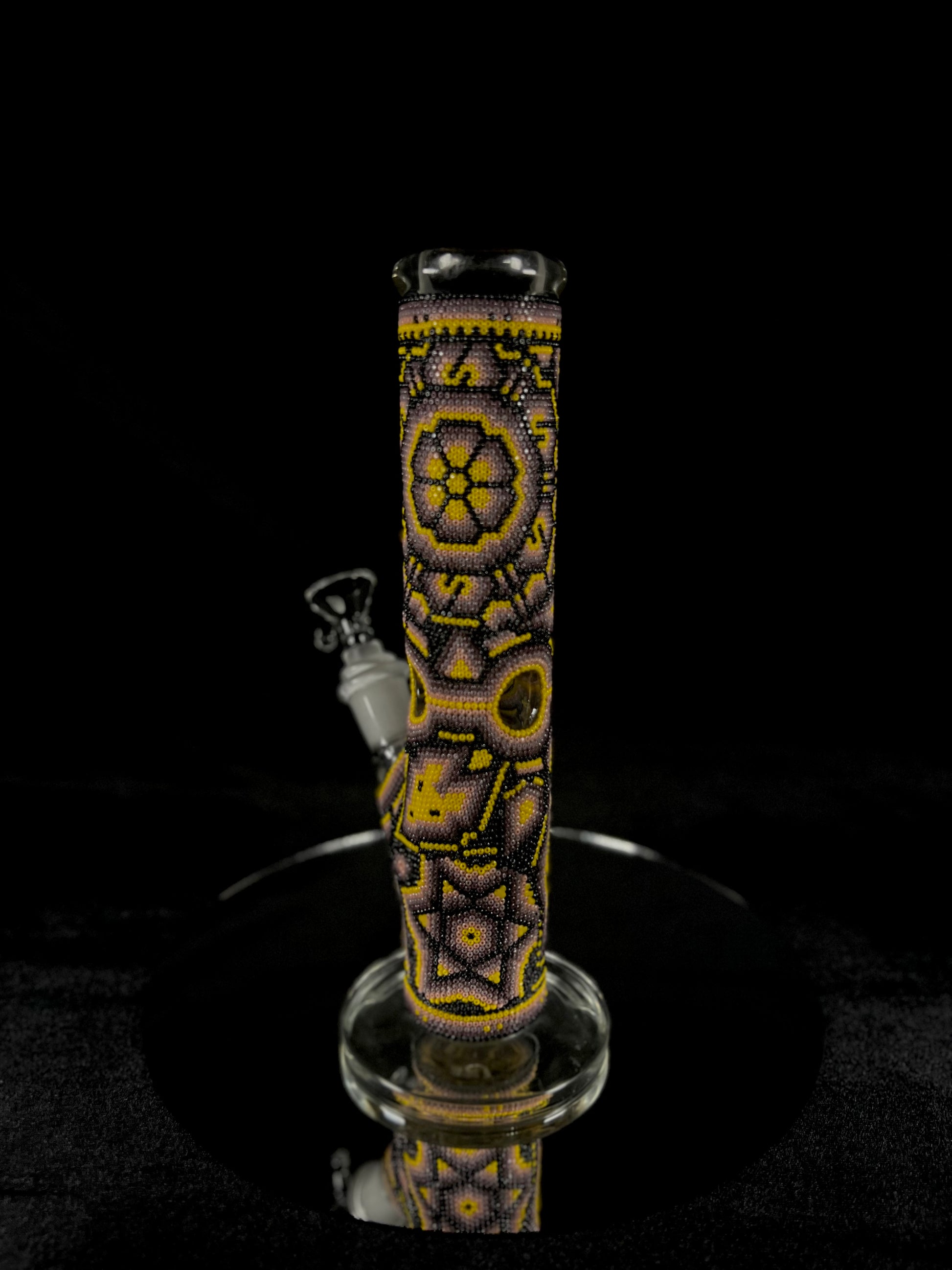 Huichol Water Pipes: These exquisite water pipes feature unique hand-beaded Huichol art with freestyled patterns and symbols. Crafted over multiple days, each piece boasts a strong epoxy base and vibrant color schemes, making it a true one-of-a-kind creation.