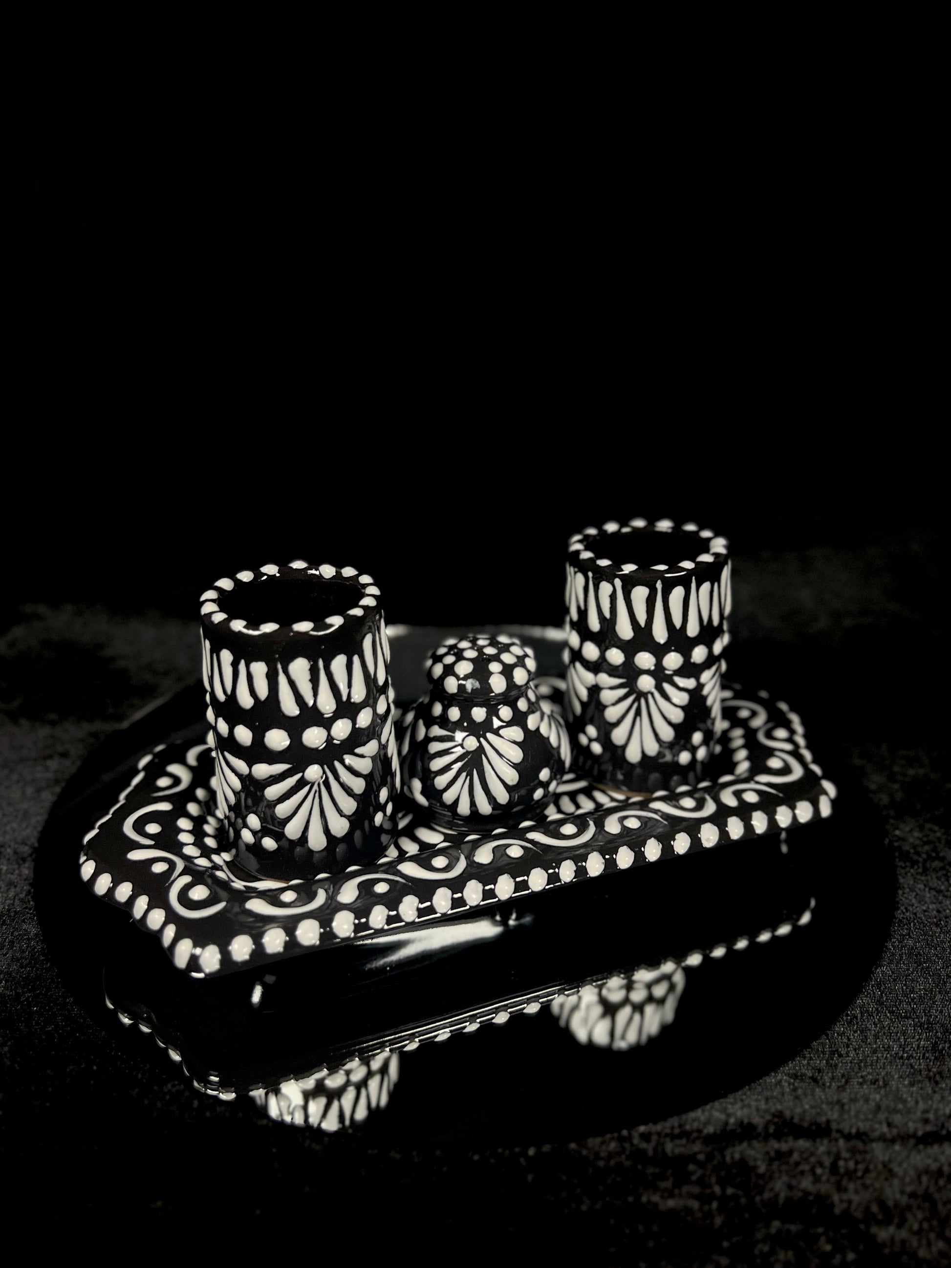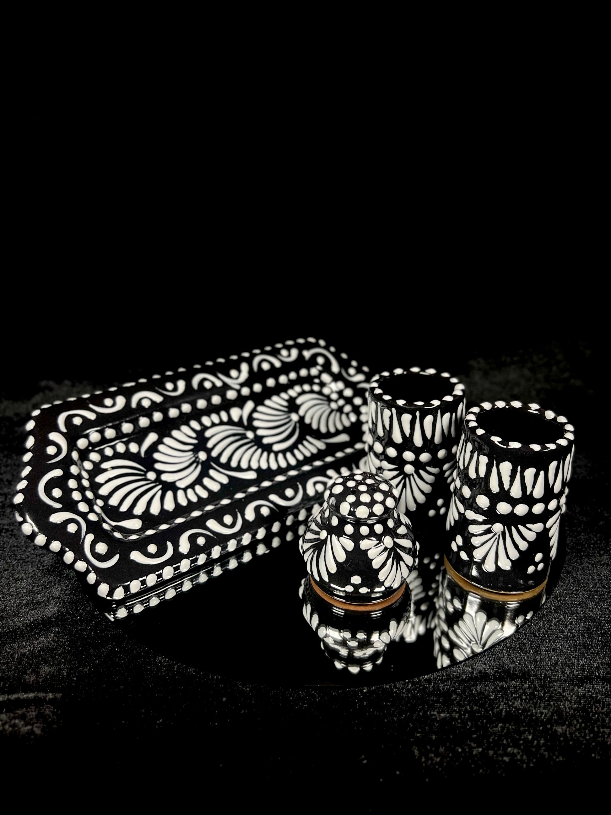 Talavera Shot Set: This essential bar collector's item includes matching shot glasses, a salt shaker, and a lime tray. Featuring authentic Talavera designs, this set brings a touch of traditional elegance and vibrant color to your barware collection.