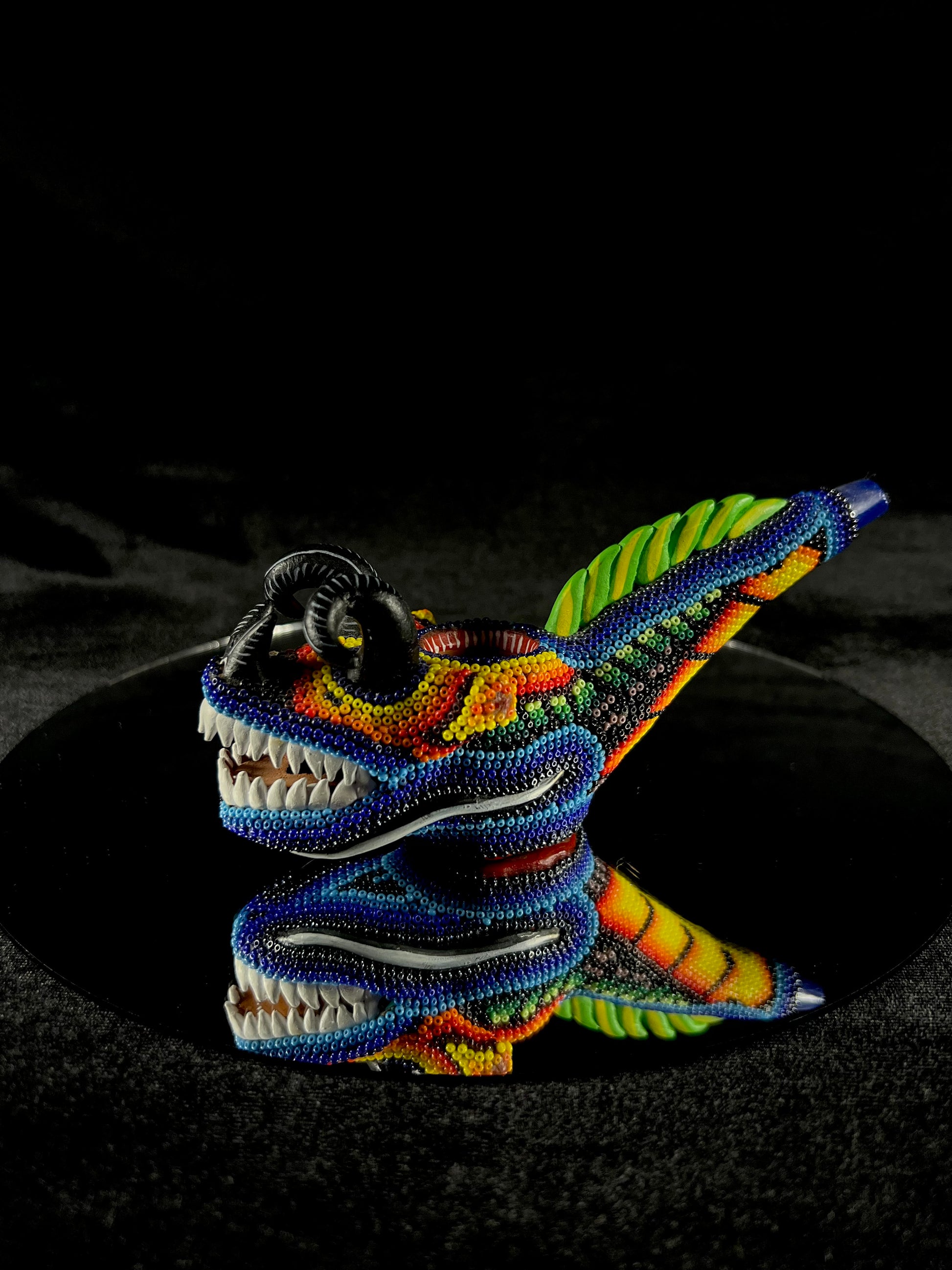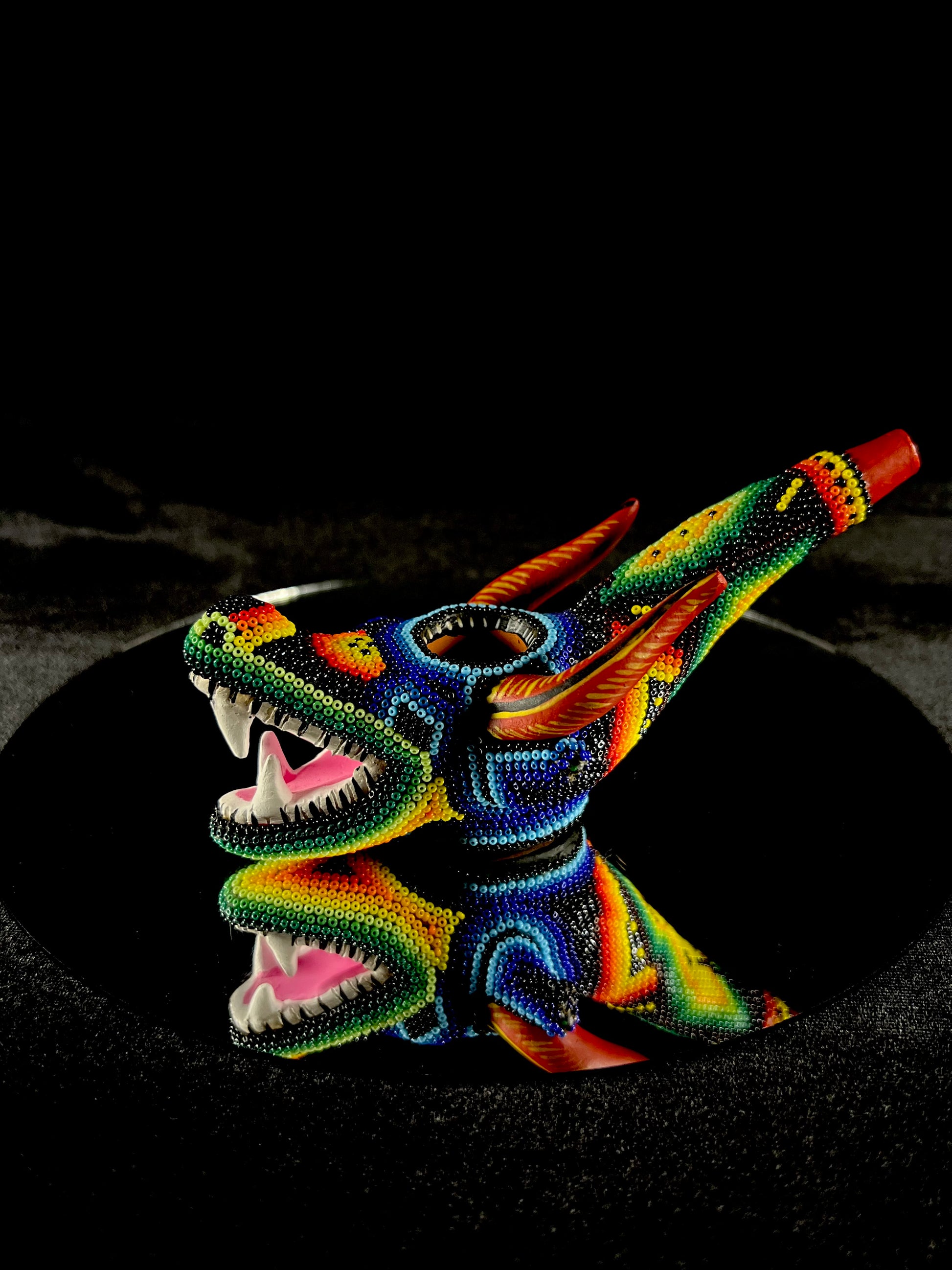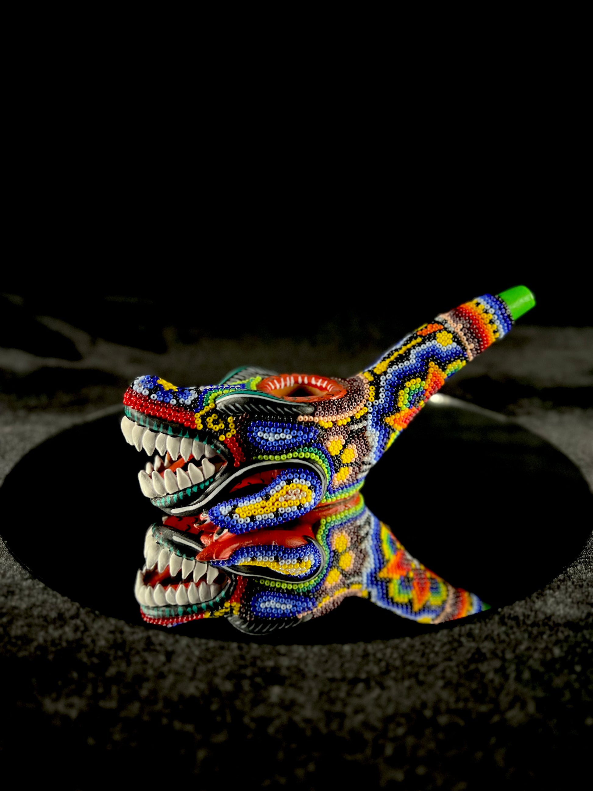 Huichol Hand Pipe: Adorned with Huichol art, these hand pipes feature freestyled patterns and symbols applied with a traditional wax base coat. The delicate Alebrijes creatures are molded from red surface clay from central Mexico, making each piece a distinctive work of art