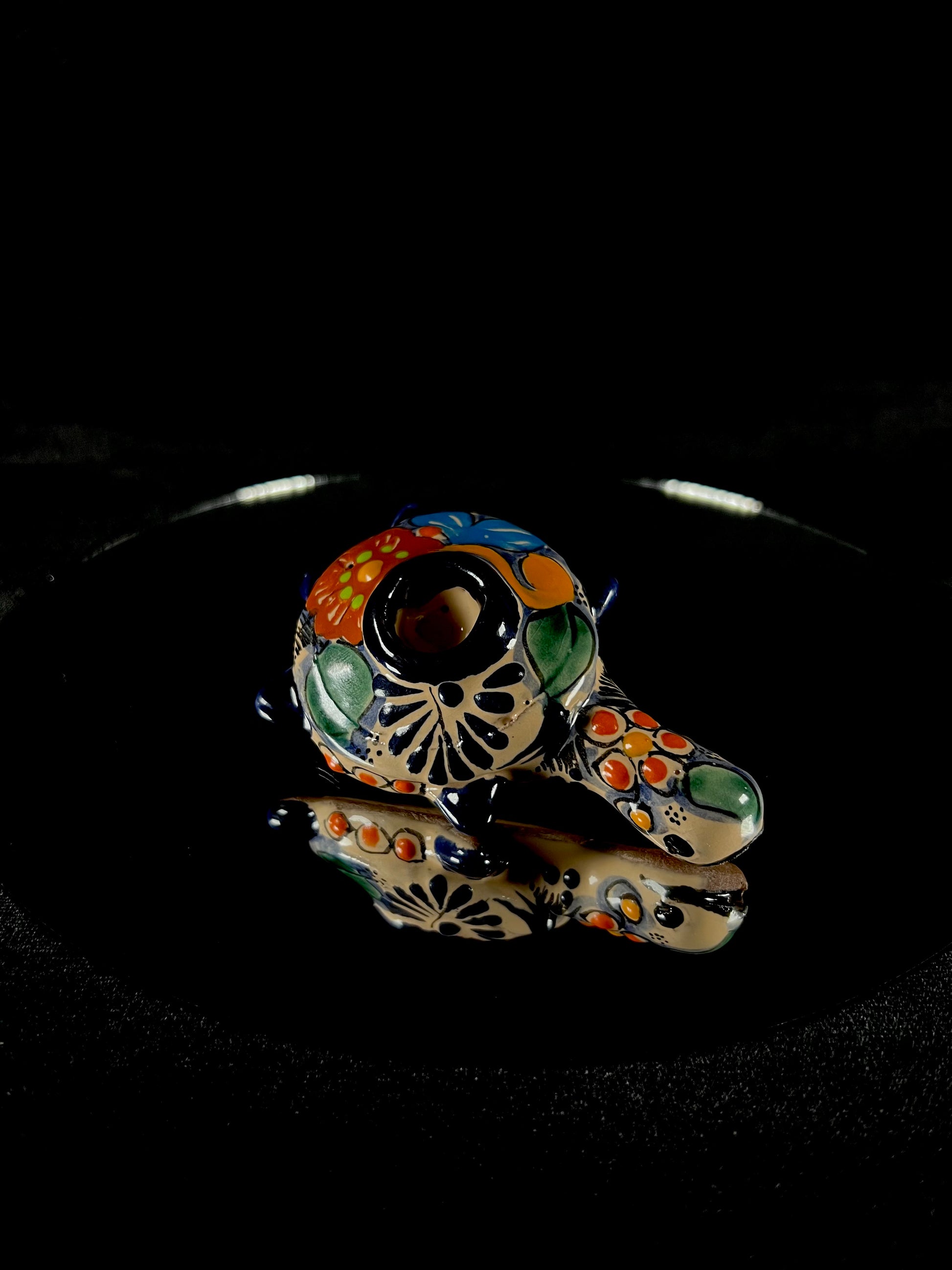 Talavera Hand Pipe: Handcrafted with intricate molds and elegant paintings, these Talavera hand pipes showcase creatures like Aztec dragons, eagles, turtles, and stingrays. Each piece is a unique masterpiece, reflecting the rich tradition of Talavera art.