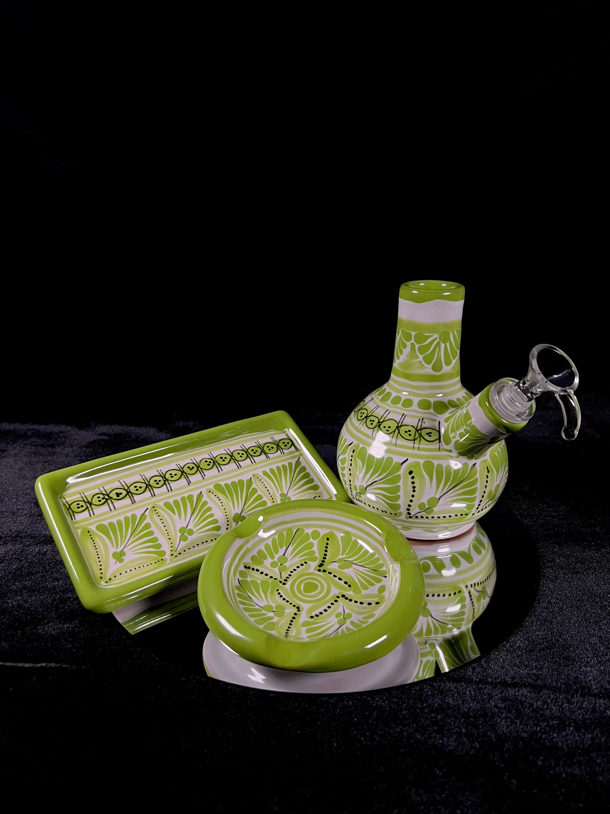 Talavera Collector Sets: Kickstart your themed Talavera collection with these sets, which include various-sized water pipes, rolling trays, and ashtrays. Each piece features matching base colors and accents with unique plumeado and floral designs, creating a harmonious and visually stunning ensemble.
