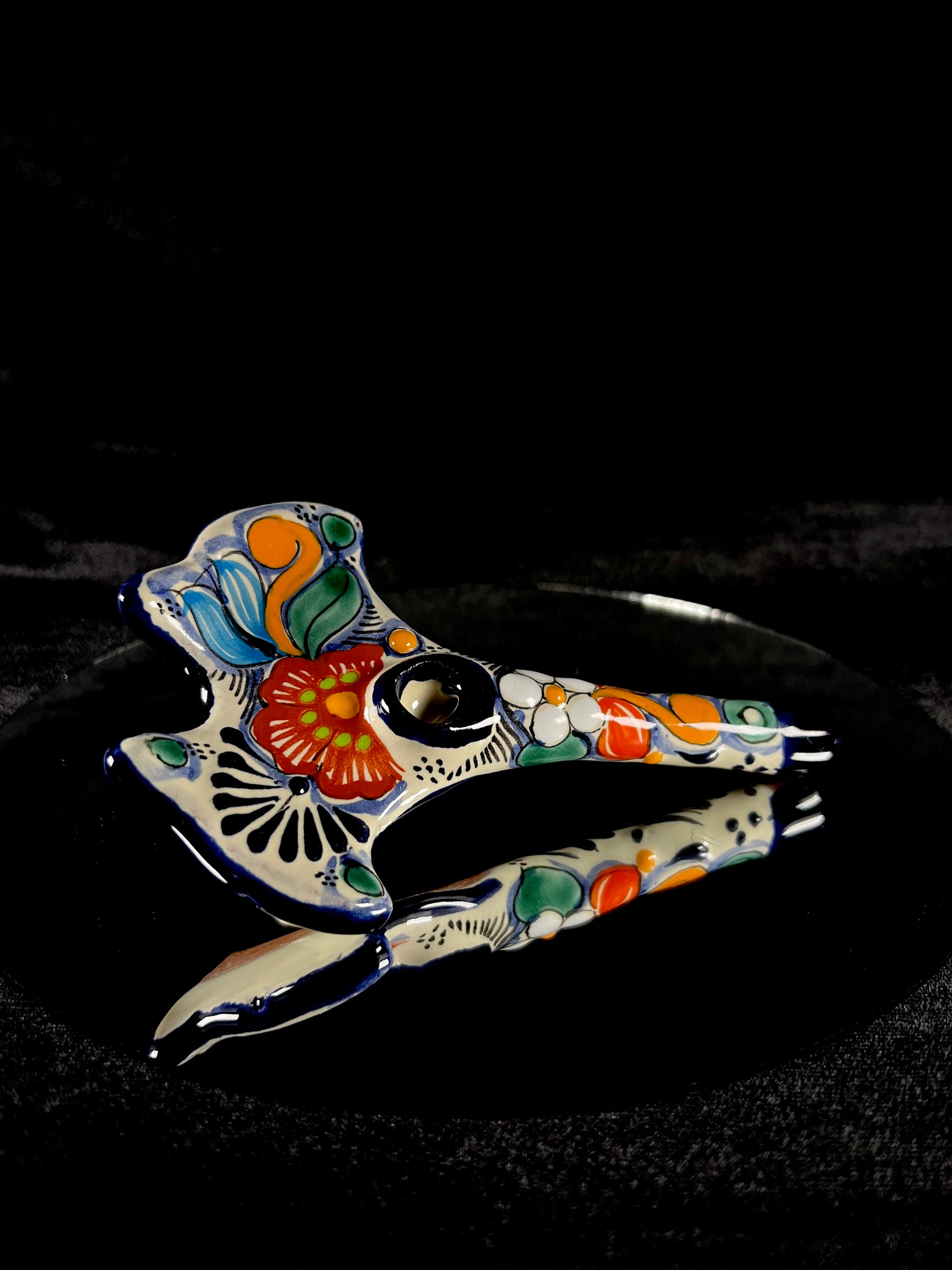 Talavera Hand Pipe: Handcrafted with intricate molds and elegant paintings, these Talavera hand pipes showcase creatures like Aztec dragons, eagles, turtles, and stingrays. Each piece is a unique masterpiece, reflecting the rich tradition of Talavera art.